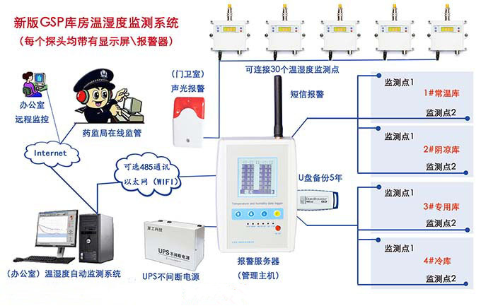 六、新版GSP藥品冷庫--溫濕度監(jiān)測系統(tǒng)示意圖: